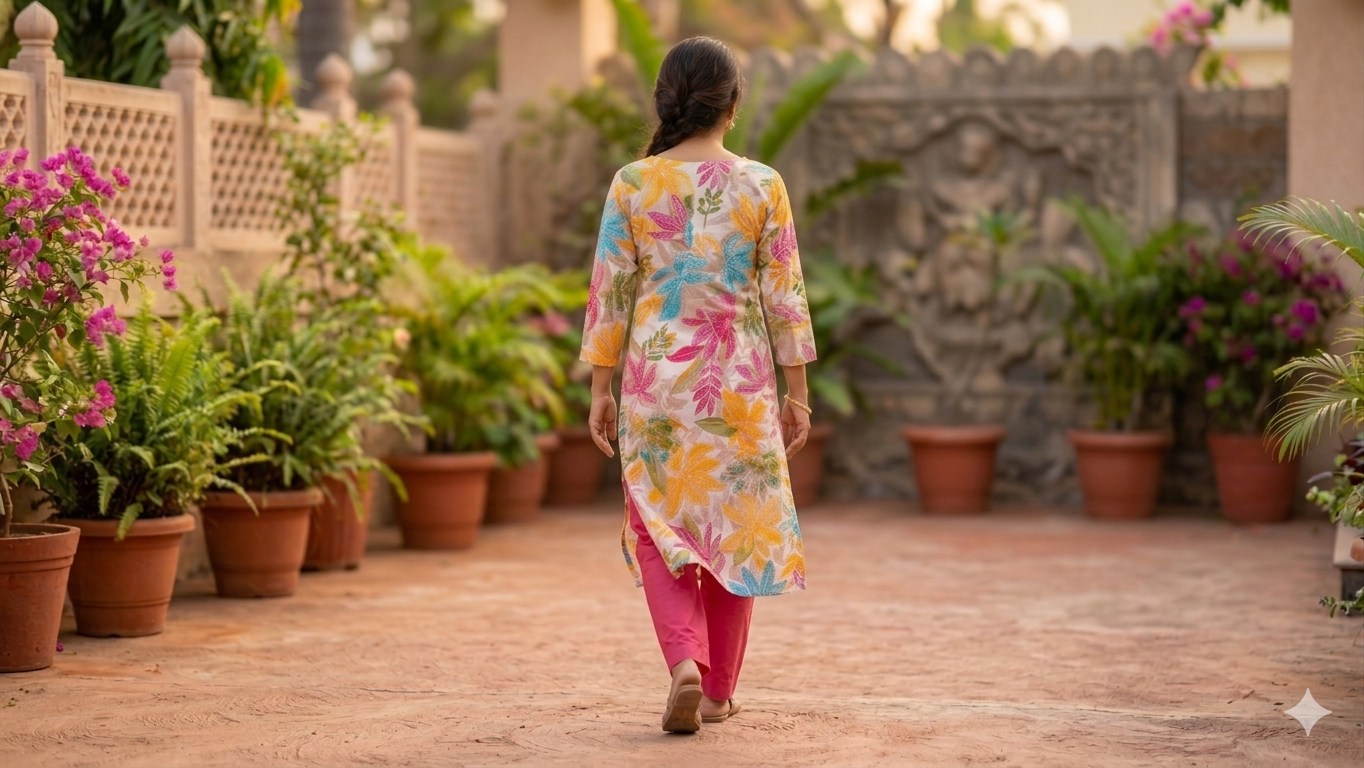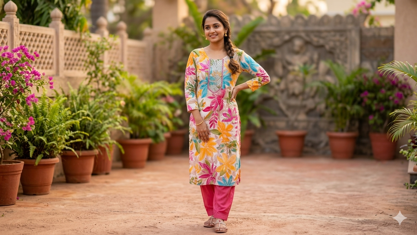 Iske saath pink pants ka combination aur bhi attractive lagta hai, jo ek classic yet trendy ethnic look deta hai. Yeh kurti na sirf functional aur stylish hai, balki breathable cotton material ke saath har din ko stress-free banata hai. ✨ Features: Soft & breathable cotton fabric, attractive floral print, elegant 3/4 sleeves, lightweight aur perfect for casual occasions.
